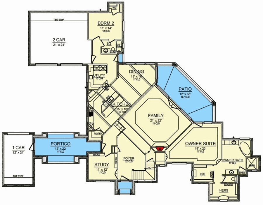 This thoughtful integration of parking areas demonstrates how the floor plan balances practical needs with overall design harmony.