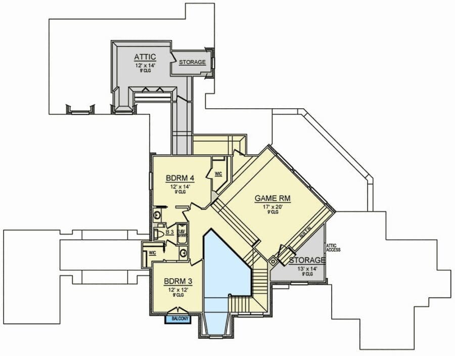 A generous game room sits at the center of the upper level, with dedicated storage space thoughtfully included in the floor plan.