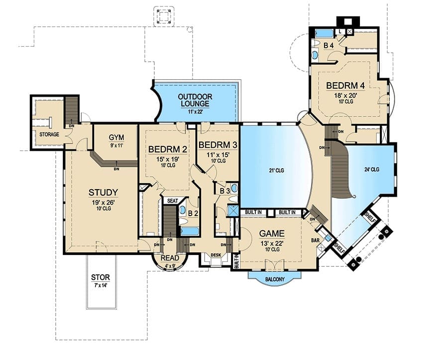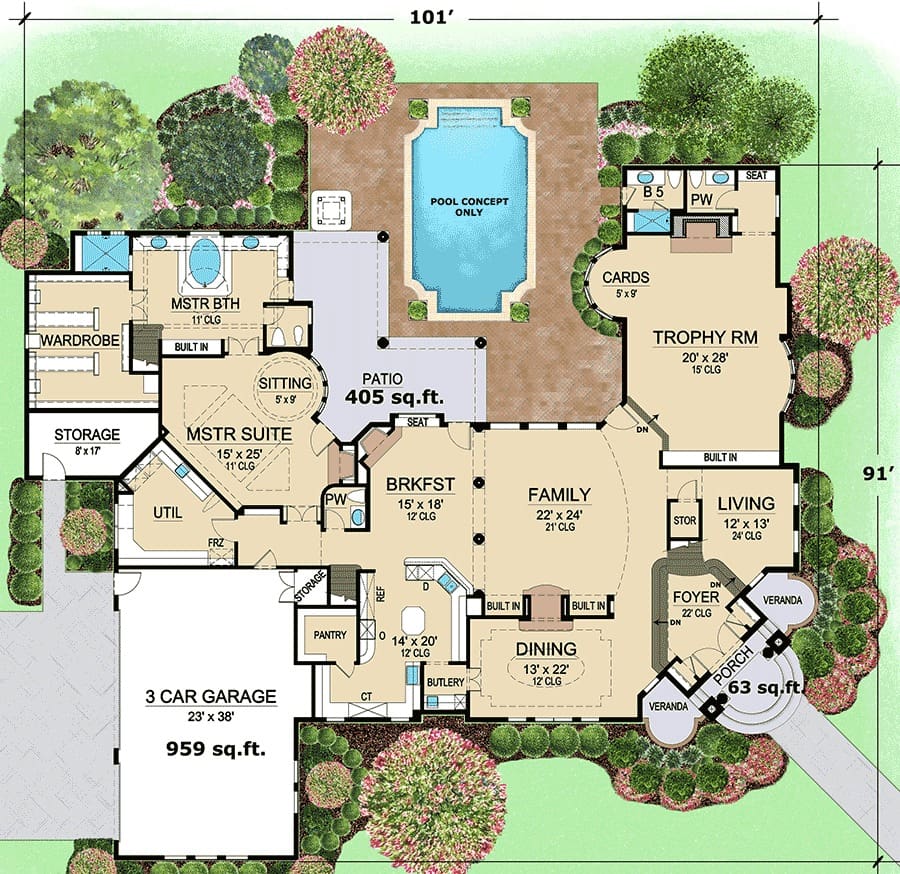 Every luxury home needs a space to showcase achievements, collectibles, or hobbies, and this house plan delivers with a trophy room.