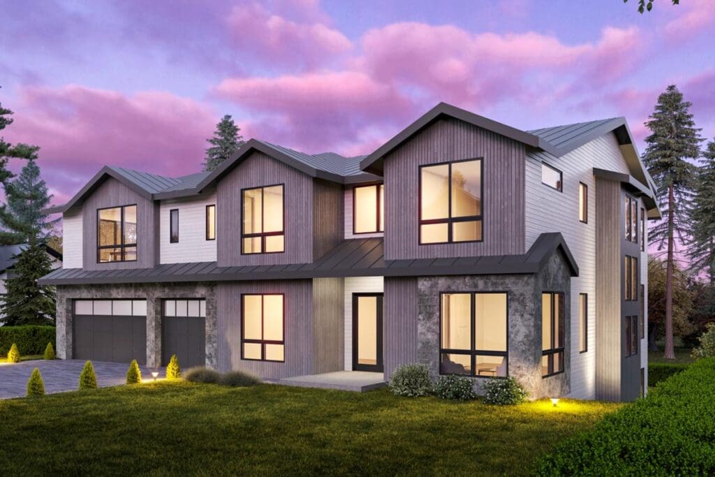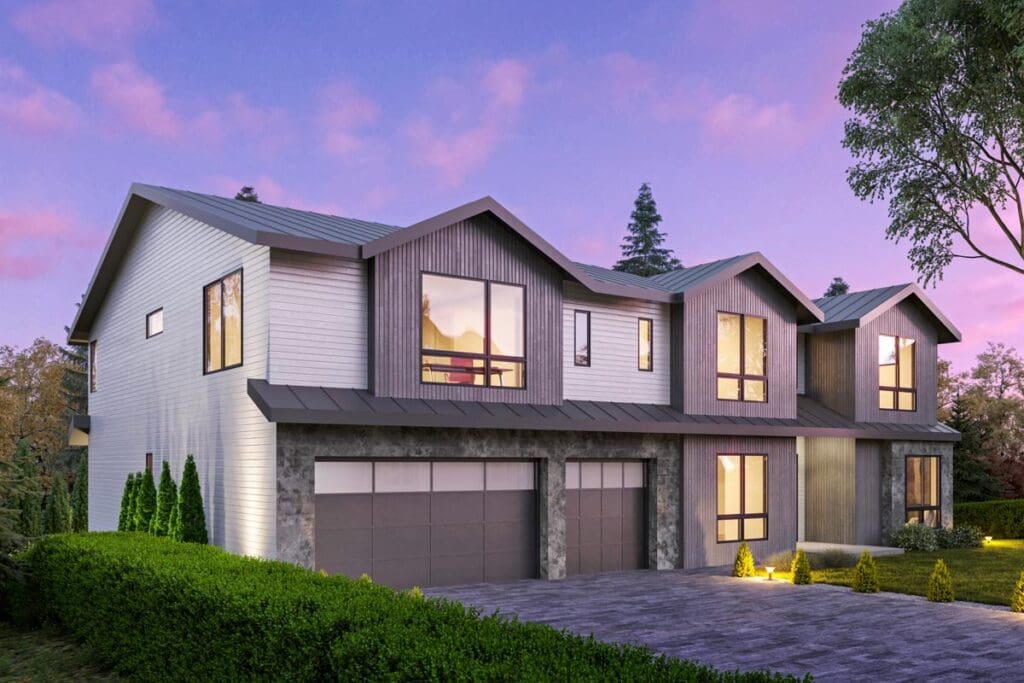 The thin vertical siding and sturdy stone accents make the front facade feel crisp, modern, and timeless all at once.