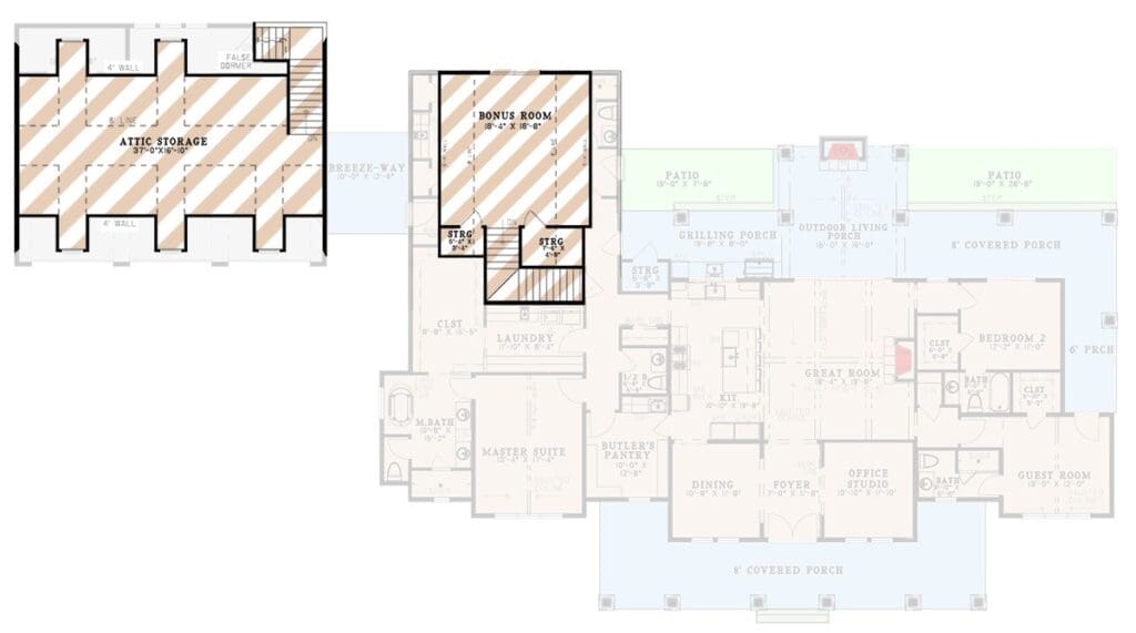 Speaking of attics, this plan even includes extra unfinished attic space above the garage for those things you really don’t need every day.