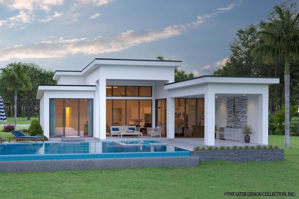 The flat roofs and metal-framed glass doors hint at the futuristic touches waiting inside.