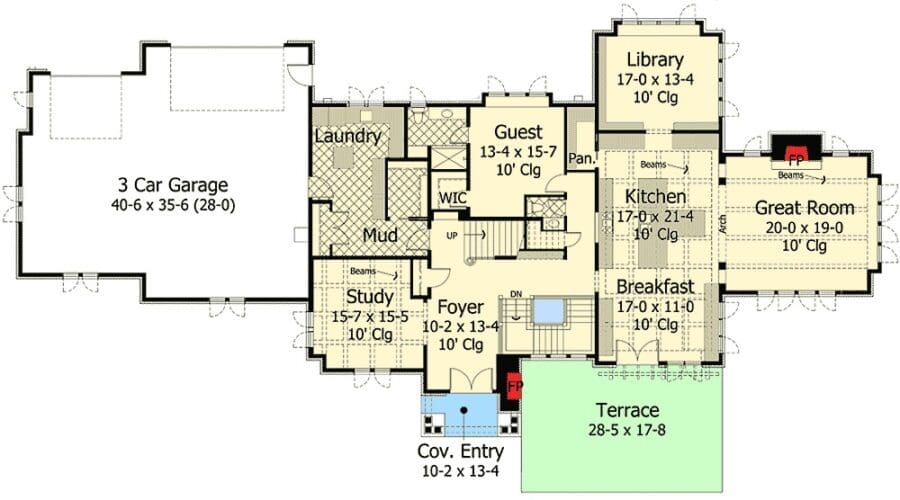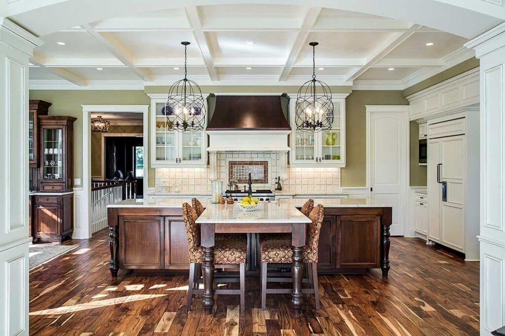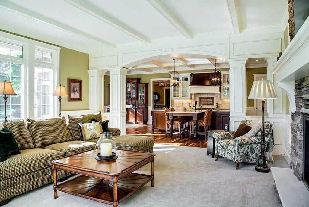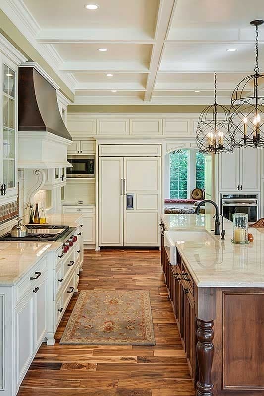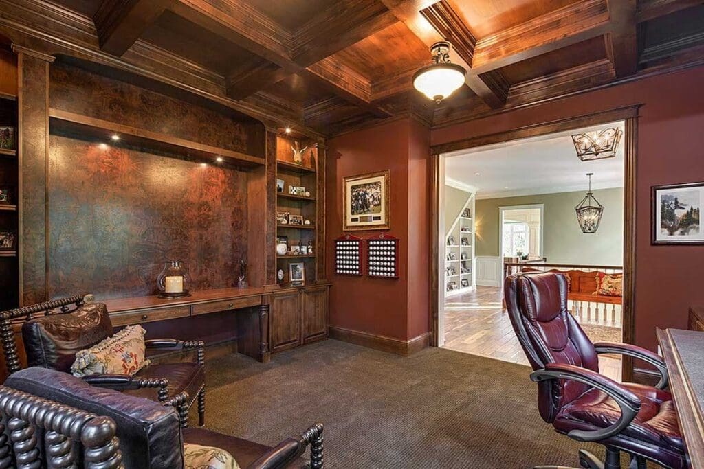 Beamed and coffered ceilings throughout the home add a touch of sophistication.