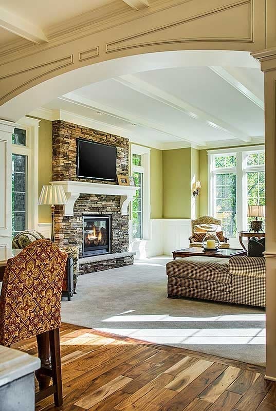 The family room fireplace remains the focal point, offering warmth and ambiance while the kitchen island keeps you connected to everyone.