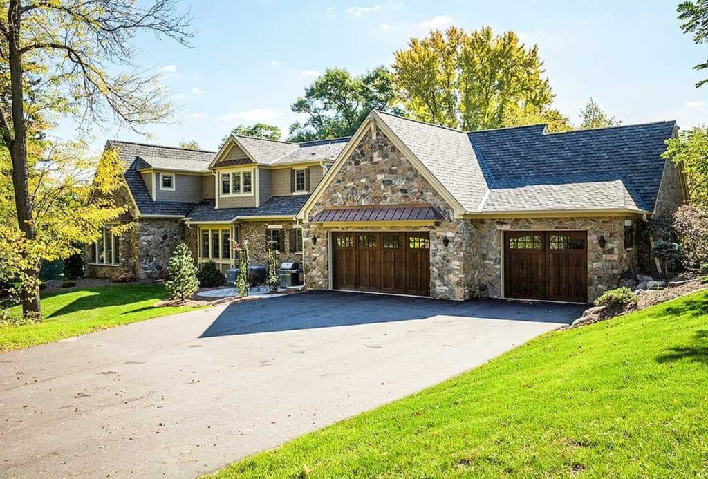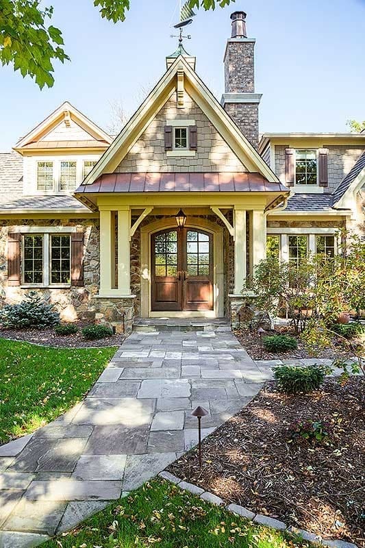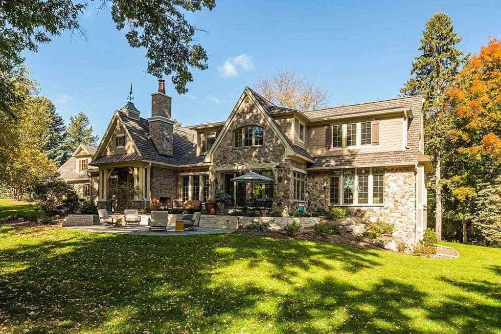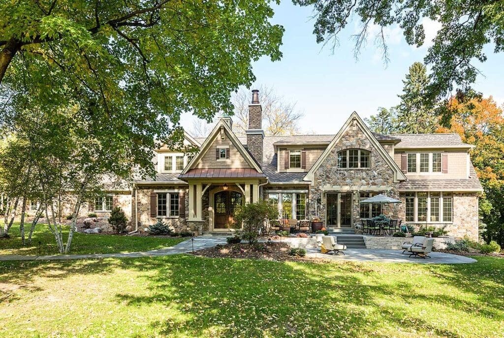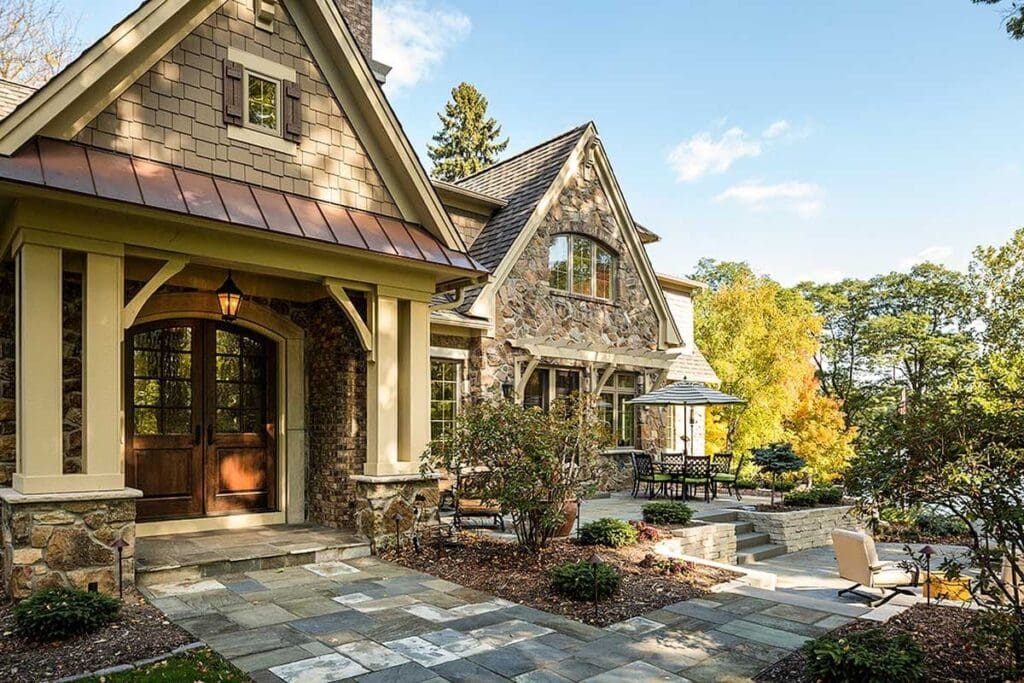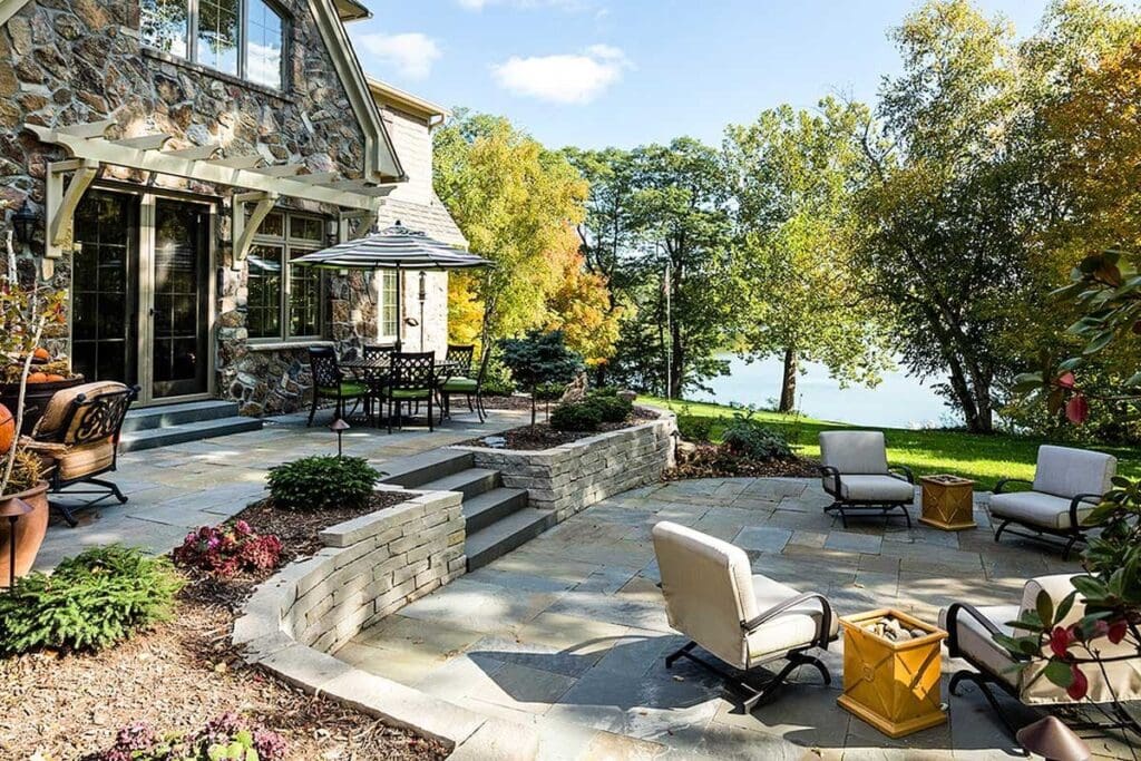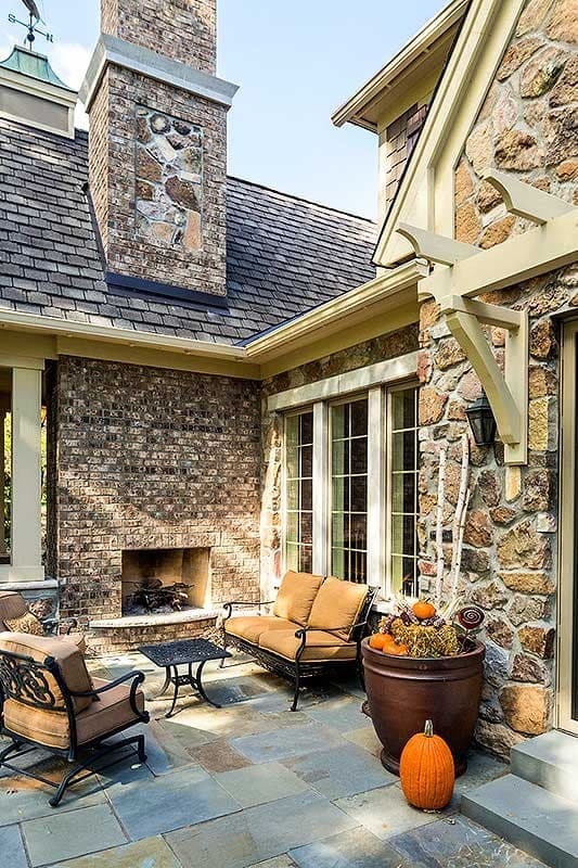 At the front, a stone terrace with an outdoor fireplace provides a welcoming entry and a cozy spot to enjoy the outdoors year-round.