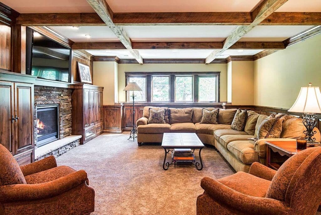 The great room is crowned with beamed ceilings, giving it that rustic texture we all love, and opens into a kitchen that deserves its own cooking show.
