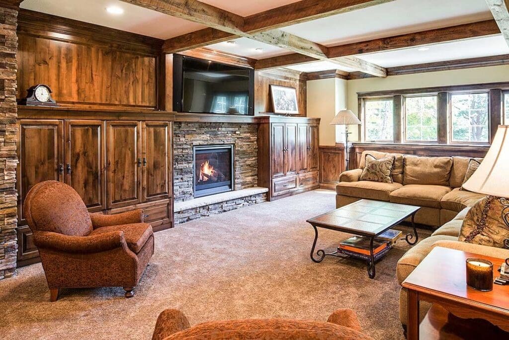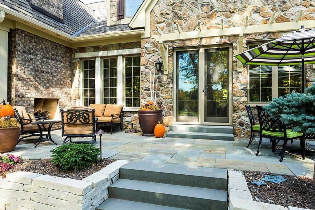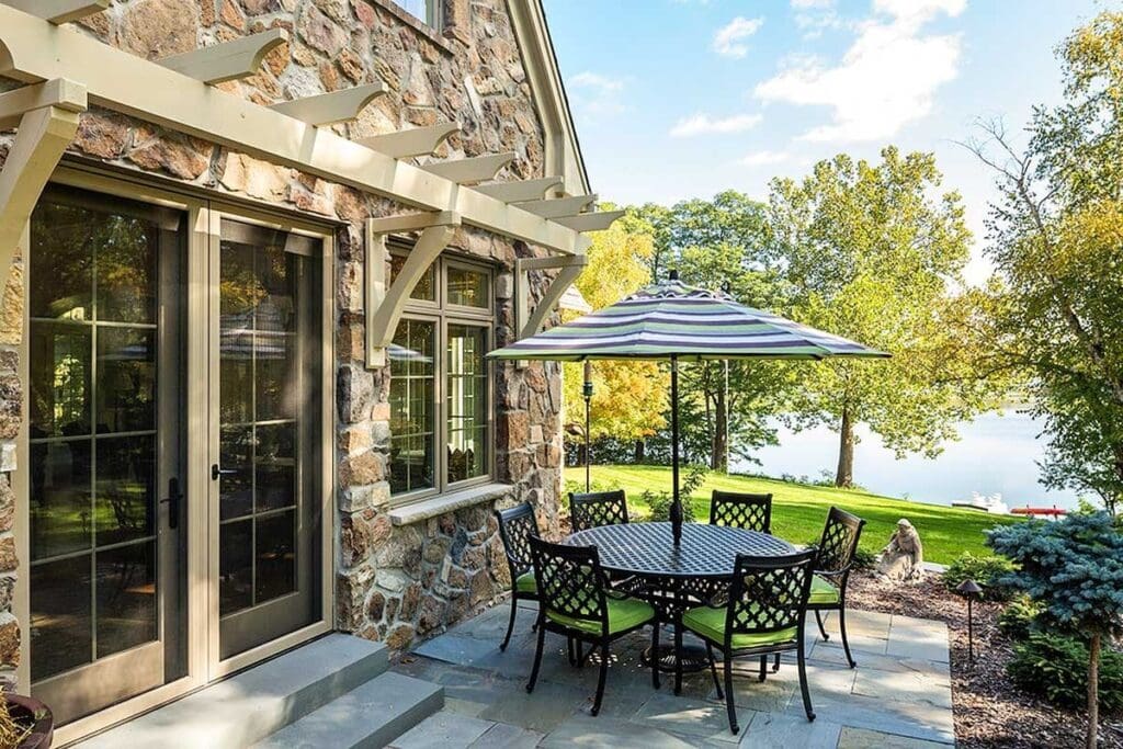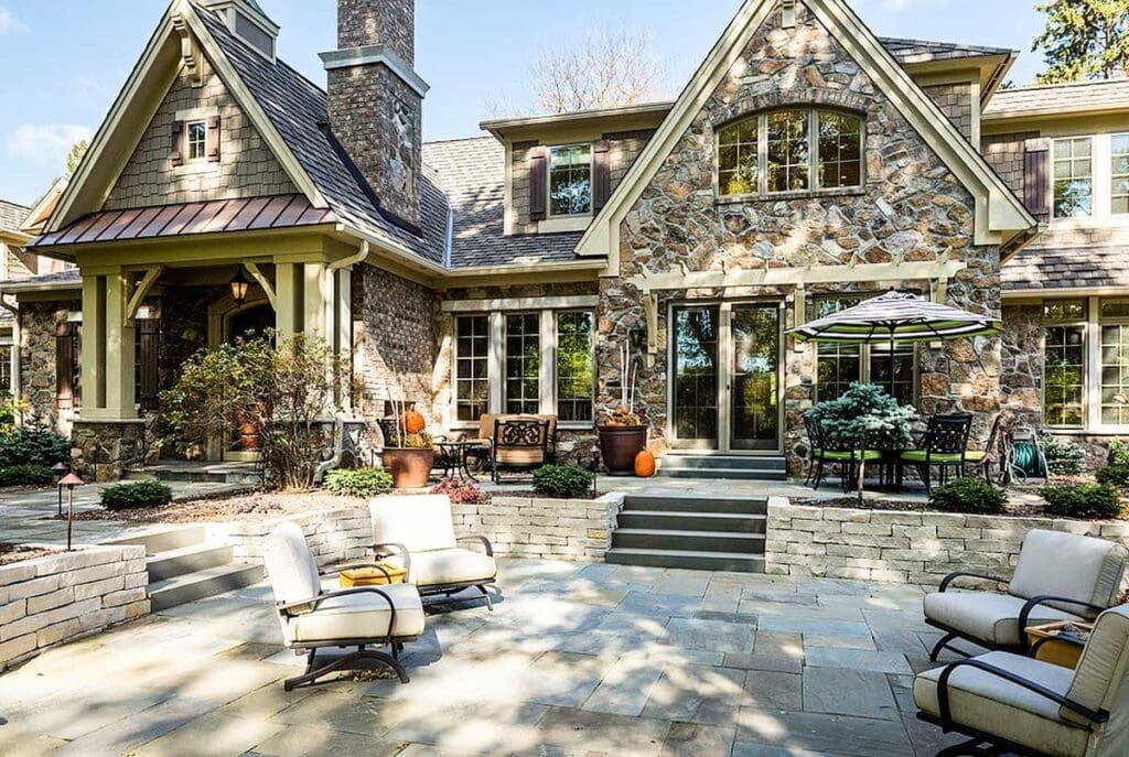 There’s a beautiful stone terrace at the front — perfect for your morning coffee or late-night marshmallow roasting sessions by the outdoor fireplace. It’s the kind of spot that makes you think, “Yeah, I can host Thanksgiving here.”