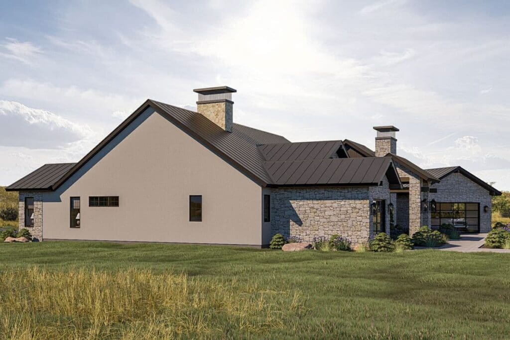 The angled garage frames the entry, adding depth and dimension that immediately sets it apart from ordinary Texas ranch-style homes.