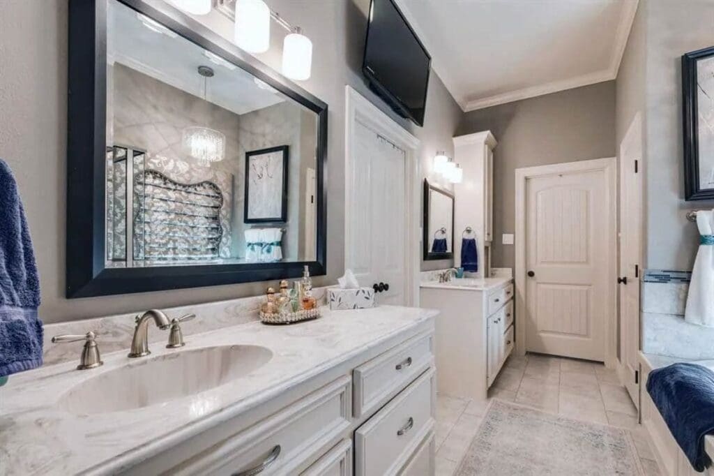 Then there’s the master bath — a spa-like escape with a glass-enclosed shower, a garden tub that begs for long soaks, and dual vanities that give everyone their own space.