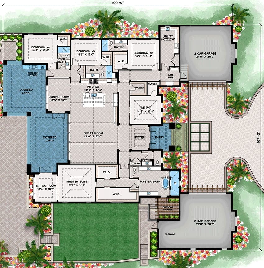 4-Bedroom 1-Story Coastal Contemporary House with Two 2-Car Garages (Floor Plan)