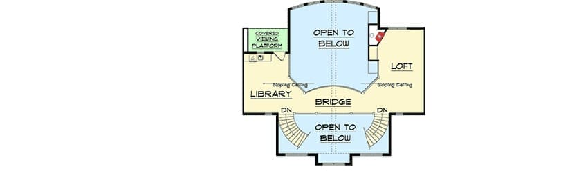 The loft’s sloped ceiling and angled fireplace give it a cozy, character-filled charm, while the upstairs library includes a small wet bar and a covered viewing platform—an unexpected treat that elevates this floor plan from impressive to unforgettable.