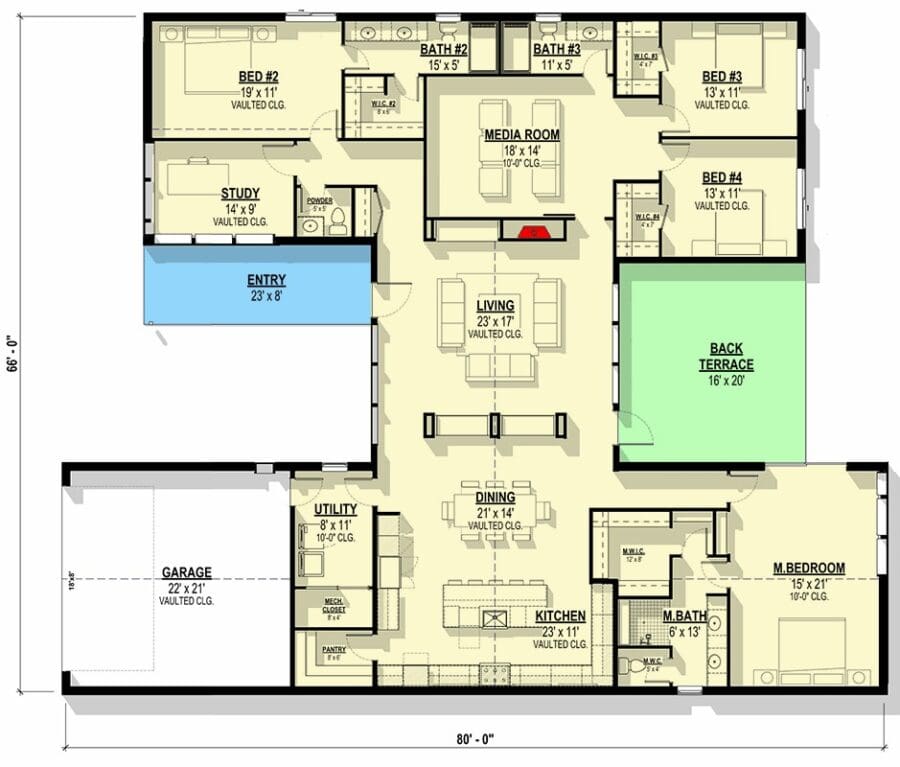 4-Bedroom 1-Story Mid-Century Modern Ranch House with Media Room (Floor Plan)