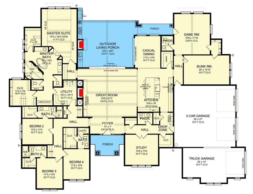 This plan has a split bedroom layout, which is designer speak for “everyone gets their space.”
