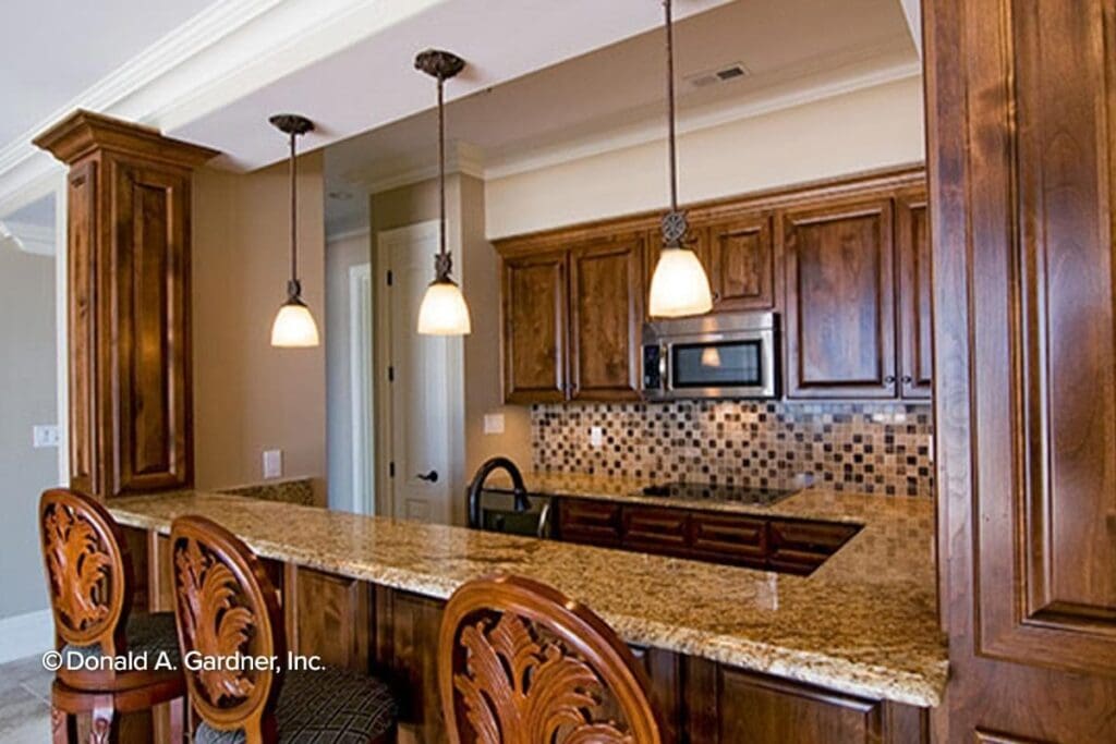 The kitchen is strategically placed for efficiency and social flow.