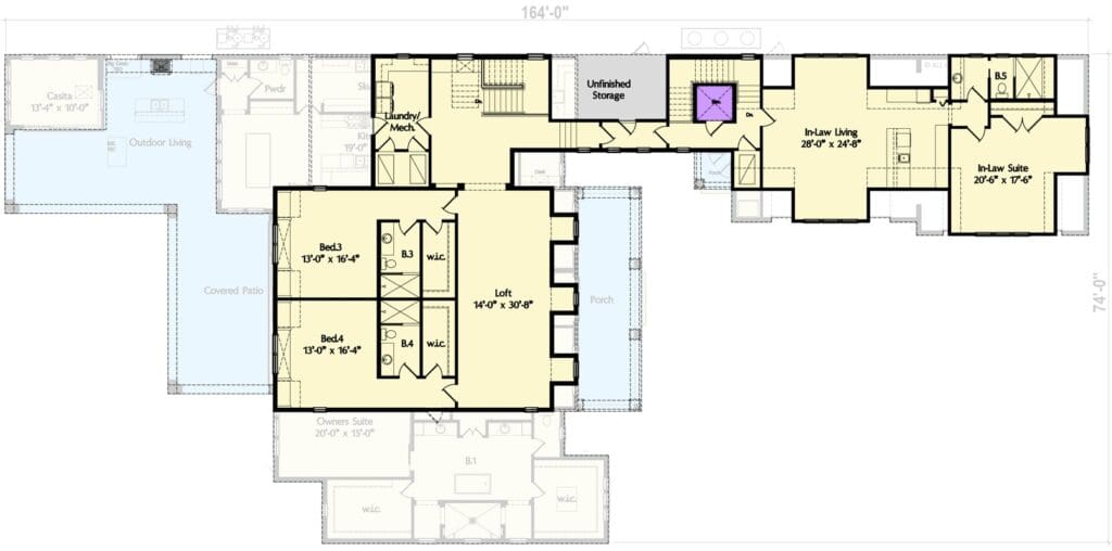 This plan shines when it comes to flexibility. With dual staircases and a private elevator serving the second-floor in-law apartment, everyone gets independence without losing connection.