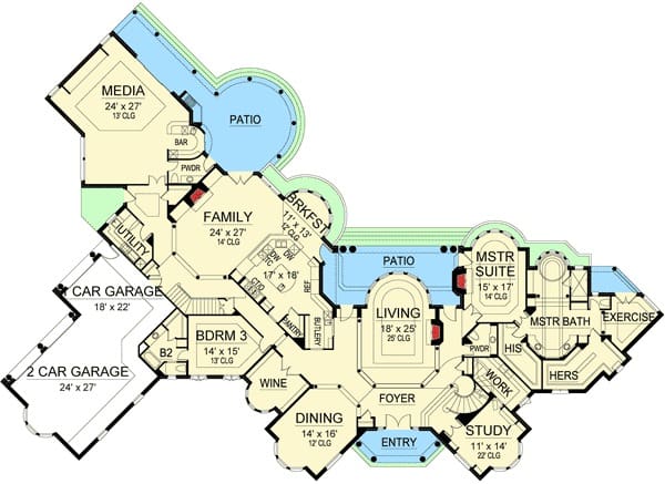 From the grand foyer to the outdoor living spaces, this house plan balances luxury and practicality like few others. Every design decision, from the tray ceilings in the master suite to the wet bar in the media room, is made with modern living in mind.