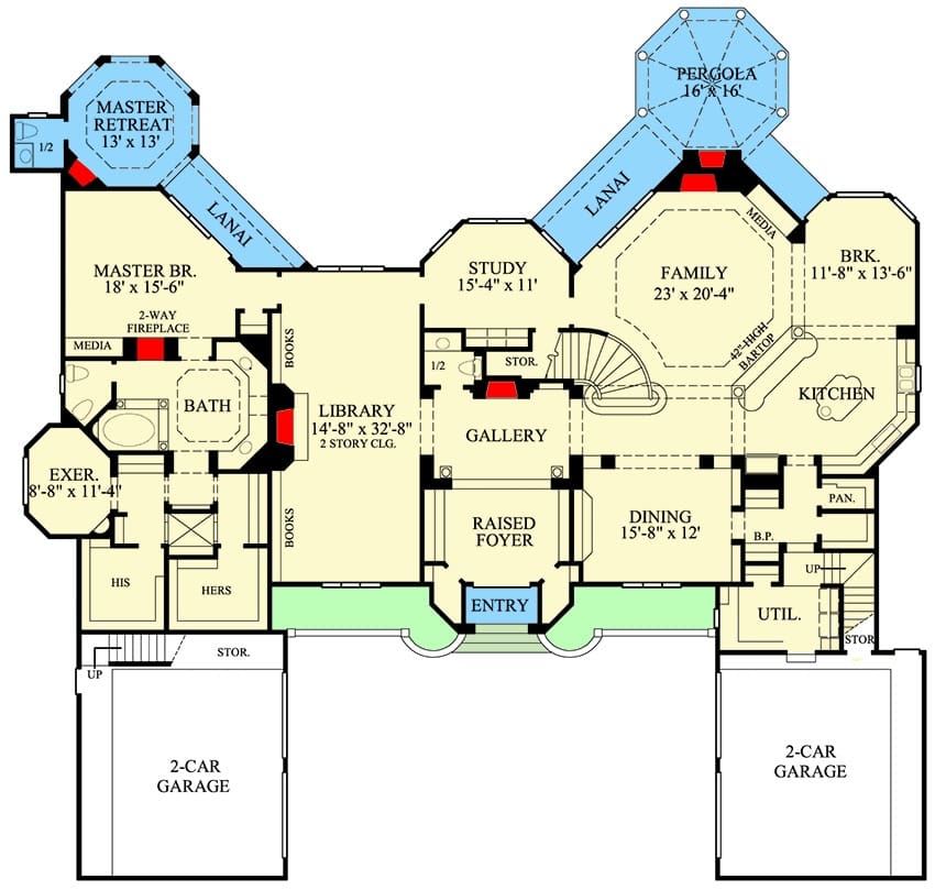 The family room itself? Picture-perfect. Cozy up by the fireplace, admire your media niche, and throw open the walls of glass for easy access to the outdoor lanai and covered pergola. Yes, there’s even a barbecue porch because burgers should always be an option.