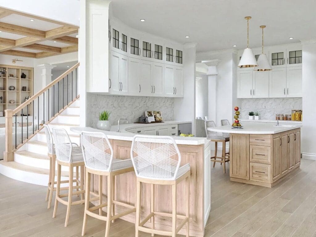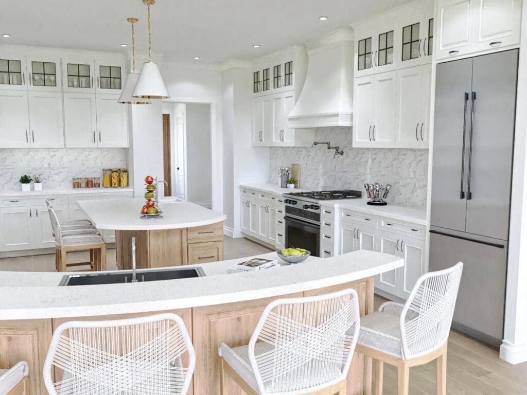 With curved counter seating, a spacious layout, and a walk-in pantry located conveniently off the mudroom, this kitchen is designed to support busy households and enthusiastic hosts alike.