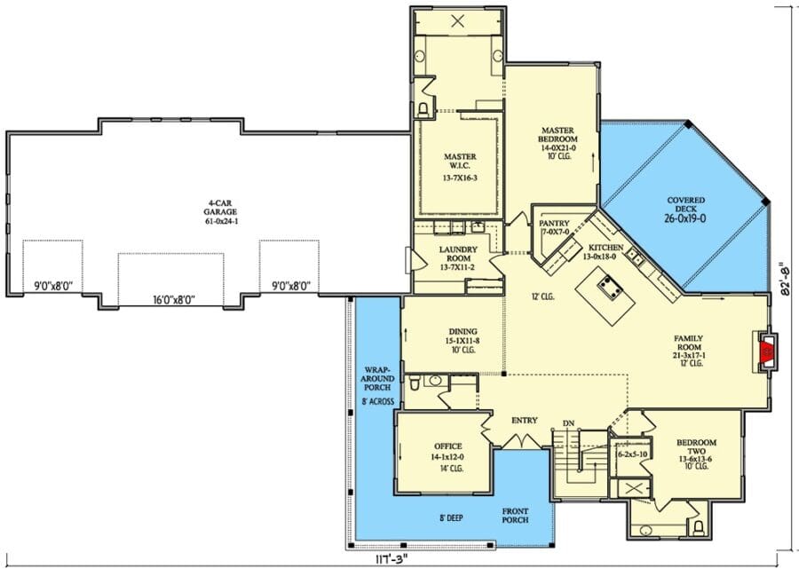 Add in the wrap-around porch, 4-car garage, and open layout, and you’ve got a plan that’s as practical as it is stunning.