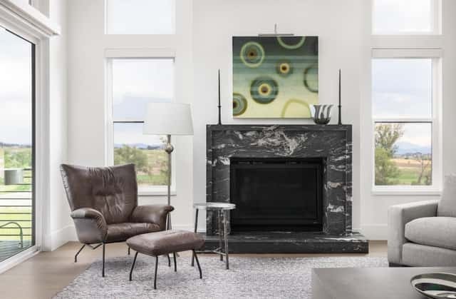 The family room, complete with its cozy fireplace and massive windows, serves as the heart of the home.