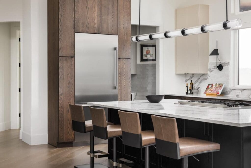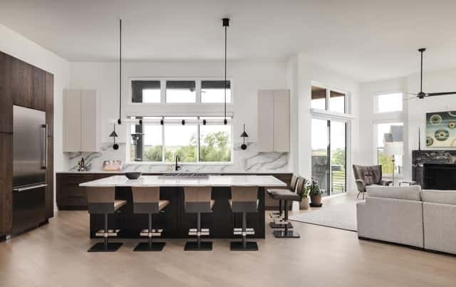 The 8′ by 8′ island takes center stage, offering space for meal prep, family breakfast, or just chatting over coffee.