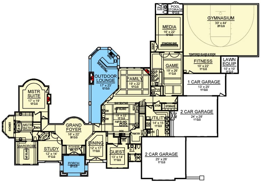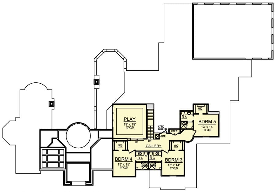 One of the most impressive aspects of this house plan is the attached five-car garage.