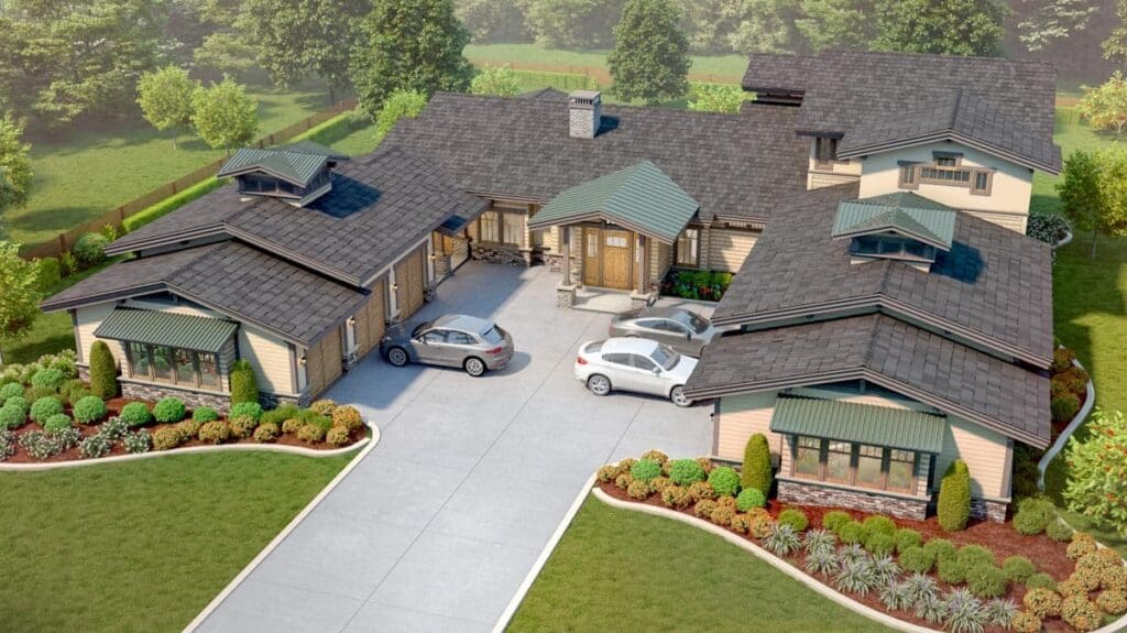 The U-shaped design of the attached garages is perfect for a corner lot. Each side includes a three-car garage, creating plenty of room for vehicles, storage, or hobbies.