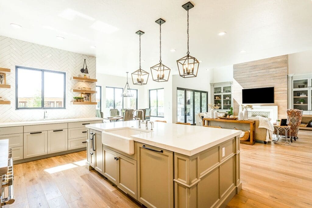 The oversized island has the sink facing forward, which means you can prep your avocado toast while watching the fire crackle or the kids doing… whatever kids do. Probably launching crackers into space.