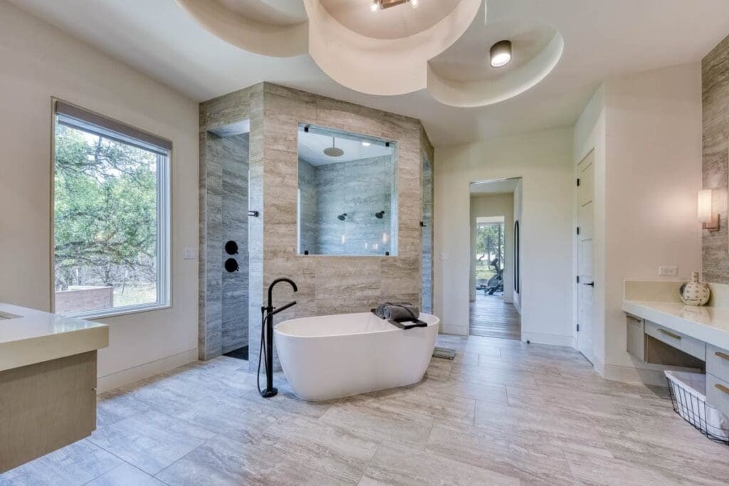The en-suite bath features dual vanities, a walk-in shower, a soaking tub, and direct access to the walk-in closet.