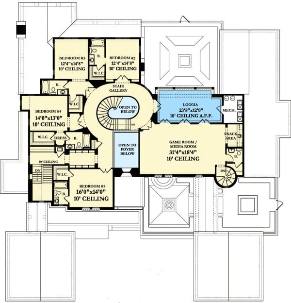 Each of the four additional bedrooms in this plan is its own private suite, complete with a walk-in closet and en-suite bathroom.