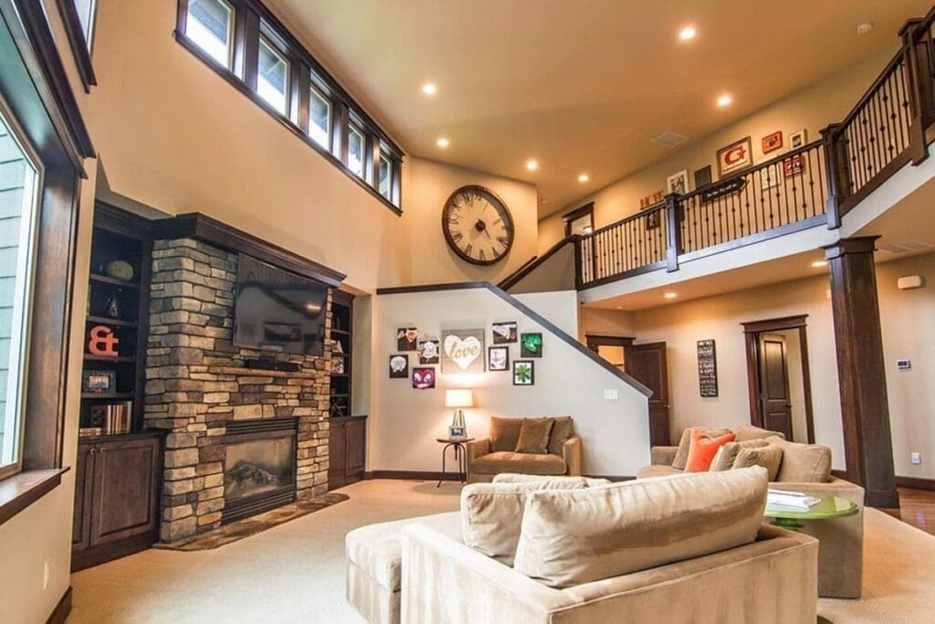 A grand fireplace anchors the space, while a vaulted ceiling soars overhead, drawing your eyes upward.