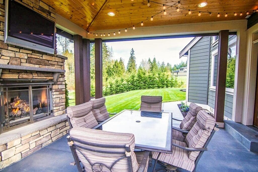 The wraparound covered porch connects directly to the living area, extending your living space outdoors.
