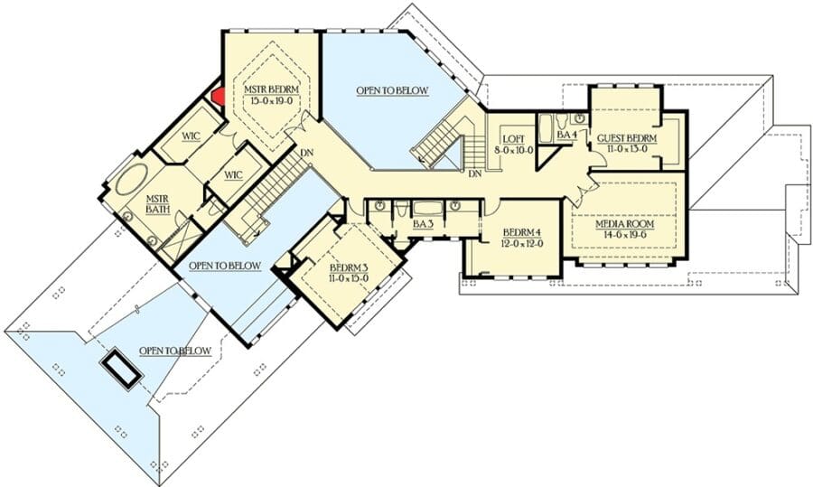The open railings, high ceilings, and natural flow make this floor plan unforgettable.