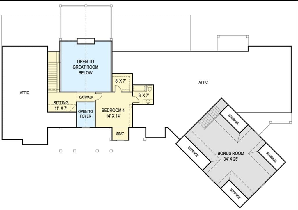 This plan includes two sets of stairs—one by the great room leading to an optional second story, and another across the house leading to a bonus room over the garage.