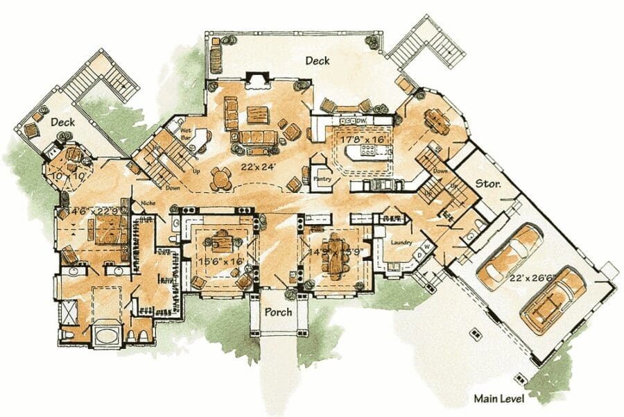 Whether you’re sipping coffee by one of its fireplaces, planning your next home improvement project, or calculating your building cost estimator to stay on budget, this design makes every square foot count.