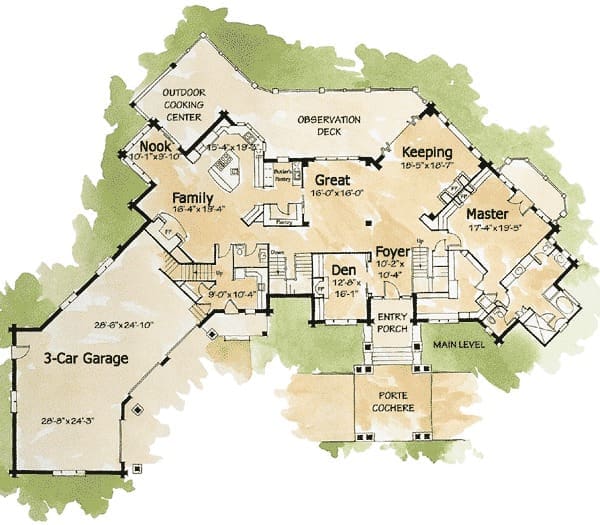 The three-car garage is well-integrated into the floor plan, making it convenient for everyday life and storage.