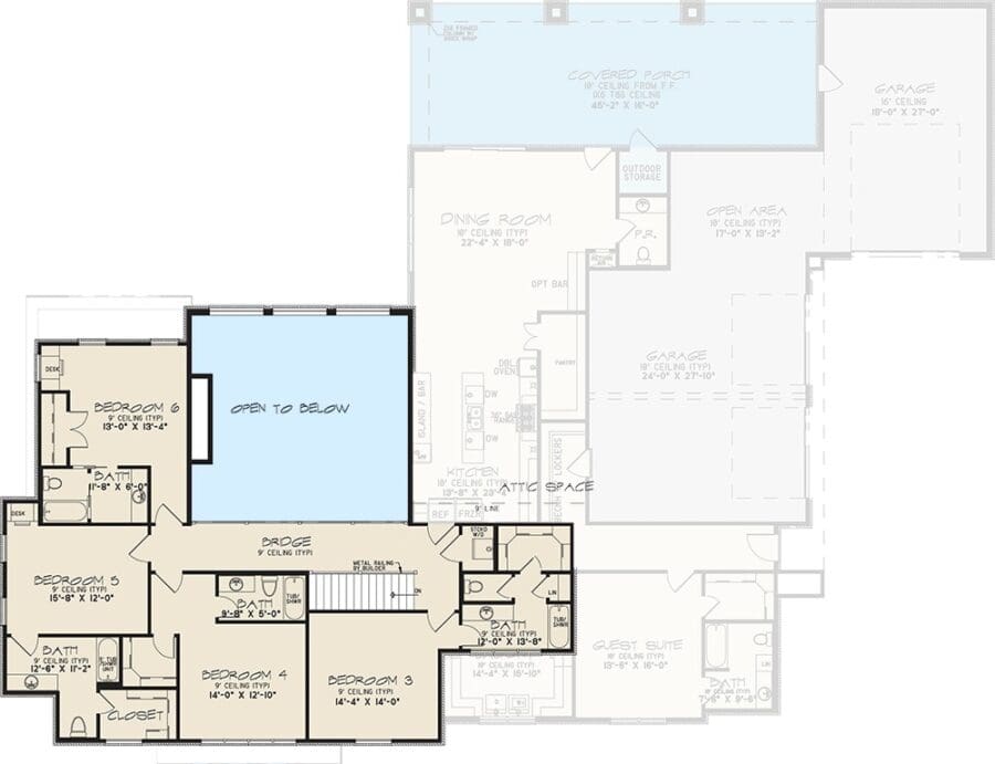 Upstairs, the floor plan opens to reveal four additional bedroom suites, each with its own private bath.