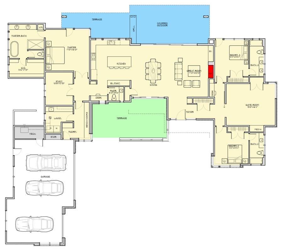 One-Story 3-Bedroom Modern House with Game Room (Floor Plan)