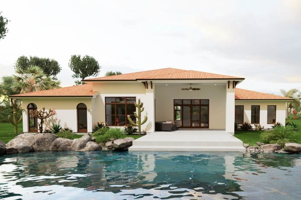 The Mediterranean aesthetic really shines in the covered rear porch area.