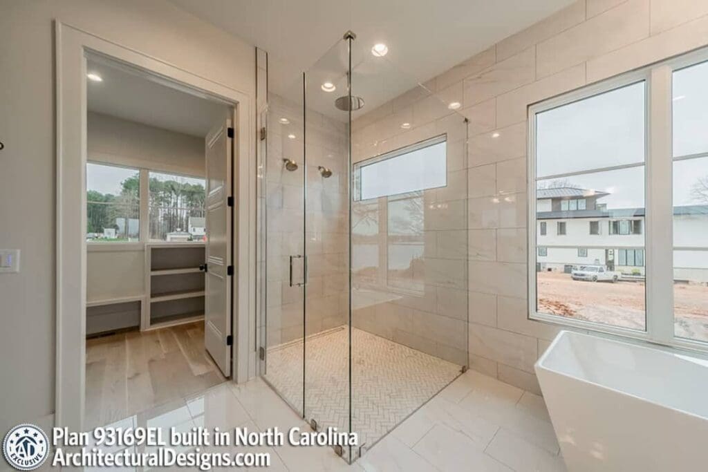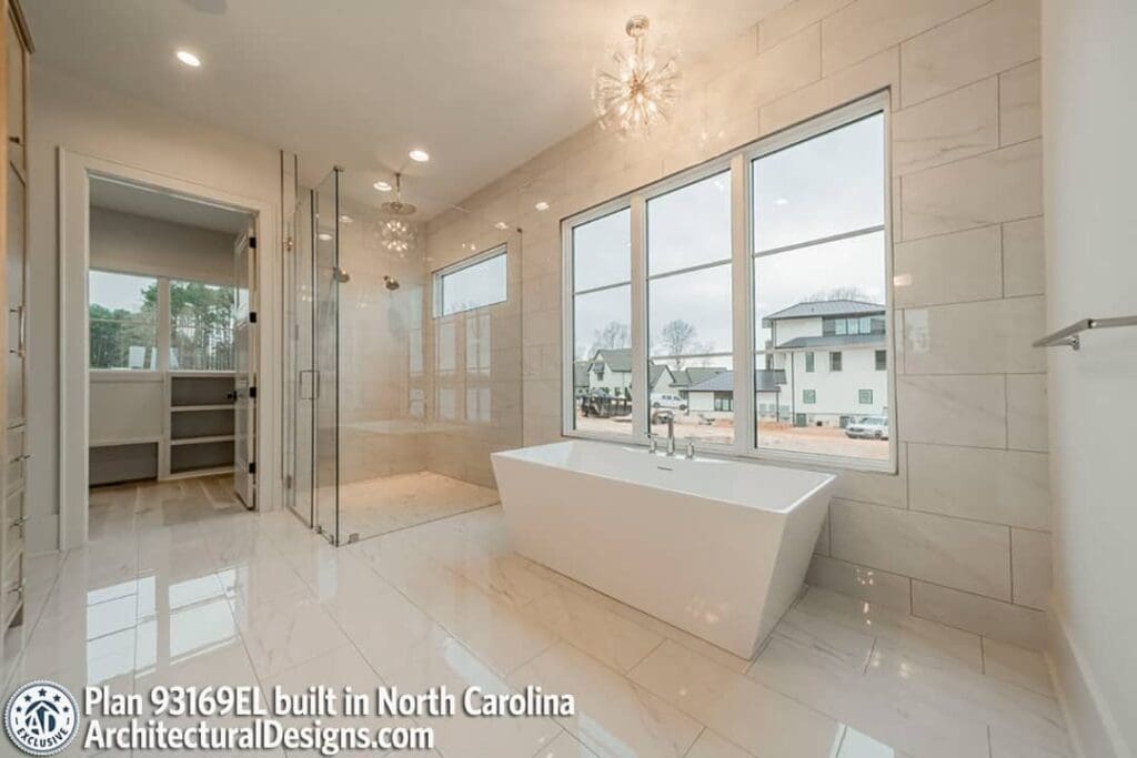 Step into the bathroom, and it’s pure luxury—dual vanities, a walk-in shower, a freestanding tub, and a walk-in closet that could double as a dressing room.
