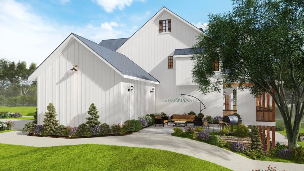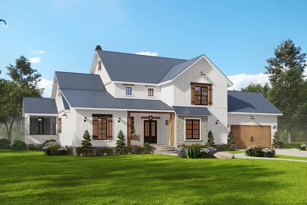 This 2-story modern farmhouse plan comes in at a comfortable 3,231 square feet—big enough to impress, but not so massive it needs a golf cart to get around.